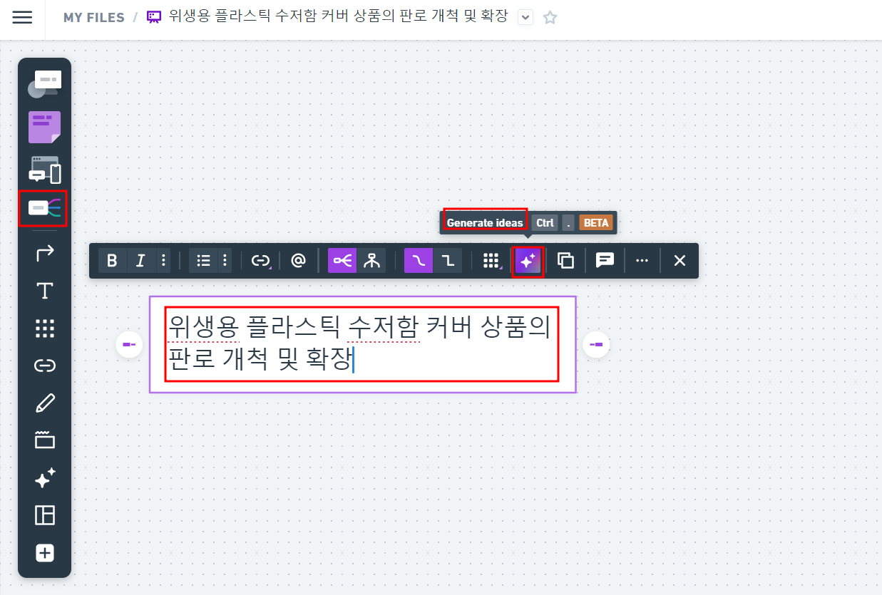 그것을 클릭을 하고, 아이디어 발상을 해야할 큰 주제를 입력을 합니다. 그리고 중요한 것은 바로 위에 보시면, 반짝반짝 거리는 메뉴가 있습니다. 바로 Generate ideas 기능인데요. 여기를 클릭합니다.