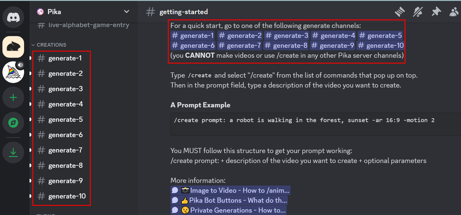 사용할 수 있는 방은 generate-1 부터 generate-10까지 사용을 할 수 있다고 합니다. 이어 프롬프트 (명령어) 사용 방법도 소개하고 있네요.