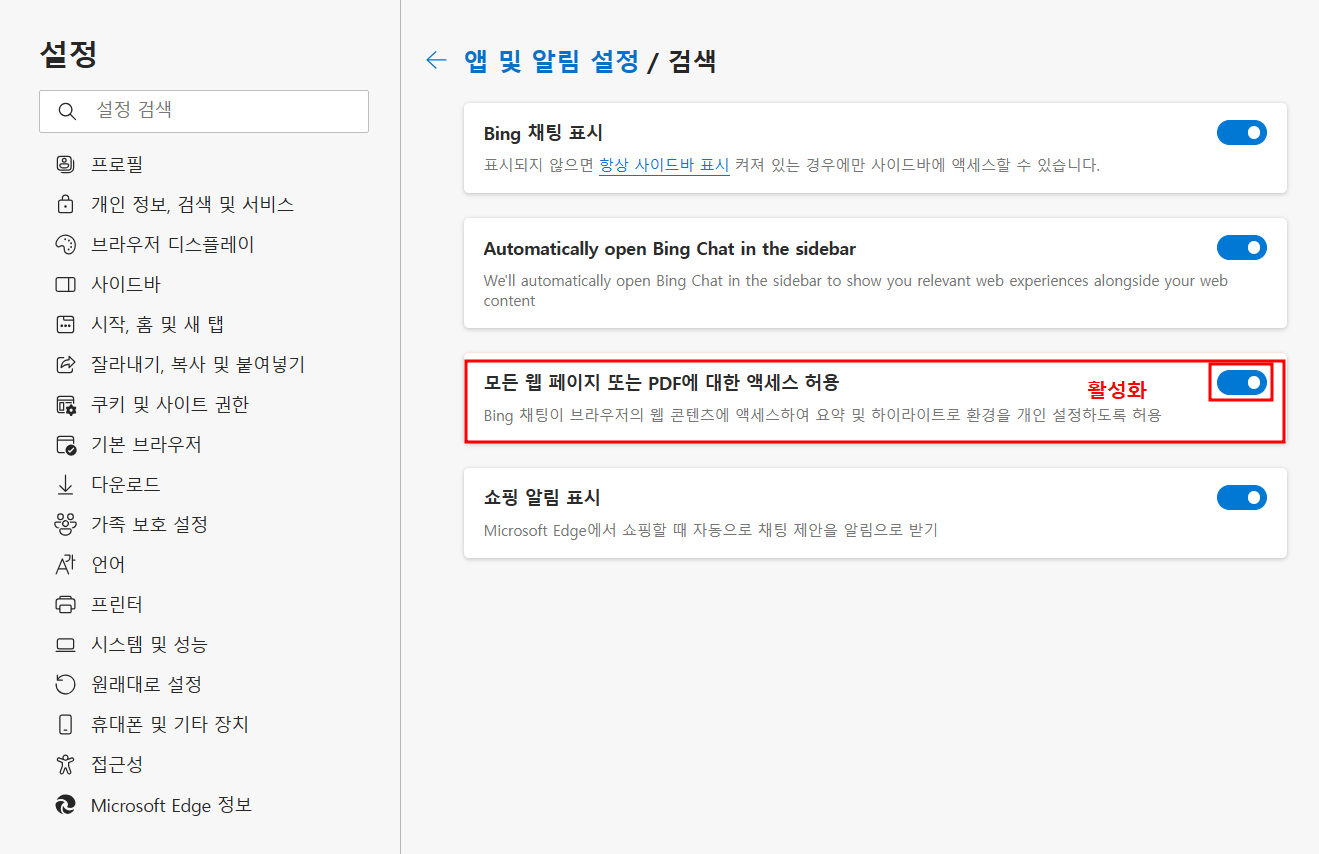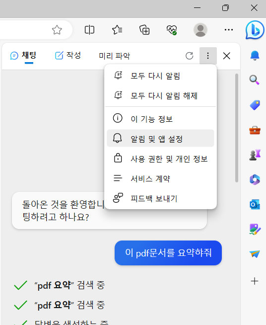 ○ Bing 요약 명령이 안된다면 조치사항