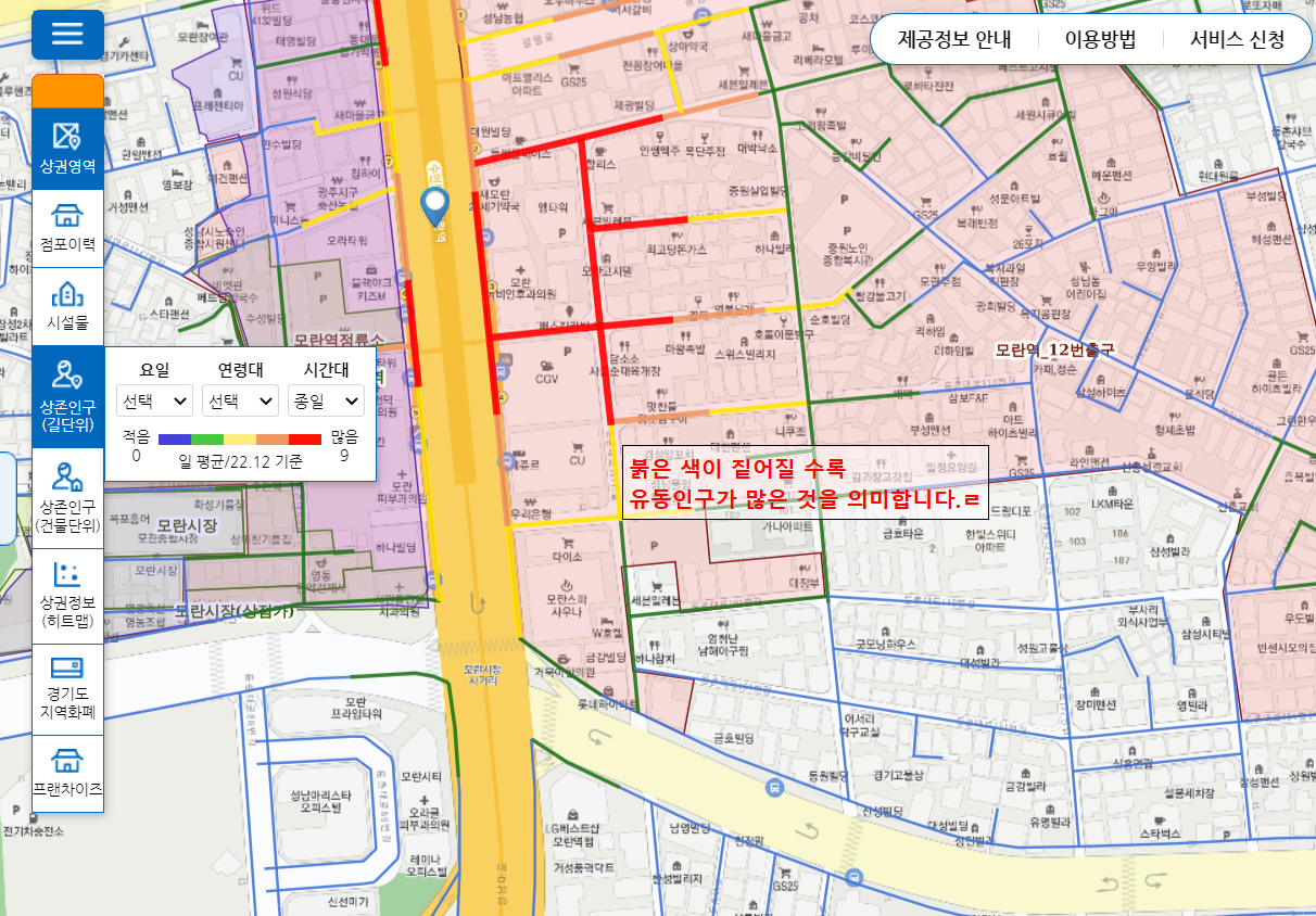 이건 현재 보고 있는 지도에서 상대적으로 유동인구가 많은 지역이 붉은색으로 표기되기 때문에, 클로즈업을 하면 좀 더 세부적으로 유동인구가 많은 곳을 볼 수 있는 것이죠. 아래는 모란역 주변으로 유동인구가 어디가 많은 지 나타난 그림입니다. 모란역 출구 쪽에 버스승강장이 있다 보니 유동인구가 상대적으로 많아 붉게 표시가 되었지요. 그리고 모란역에서 멀어지는 이면도로는 색상이 점점 푸른색으로 바뀌면서 유동인구가 줄어드는 것을 확인할 수 있습니다. 정말 신기하지요? 이 분석은 통신사에서 제공하는 공공데이터를 기반으로 이루어진 것이라고 합니다. 색상으로 유동인구가 많고 적은 것을 직관적으로 보여주니 한눈에 파악하기 용이한 것 같아요.
