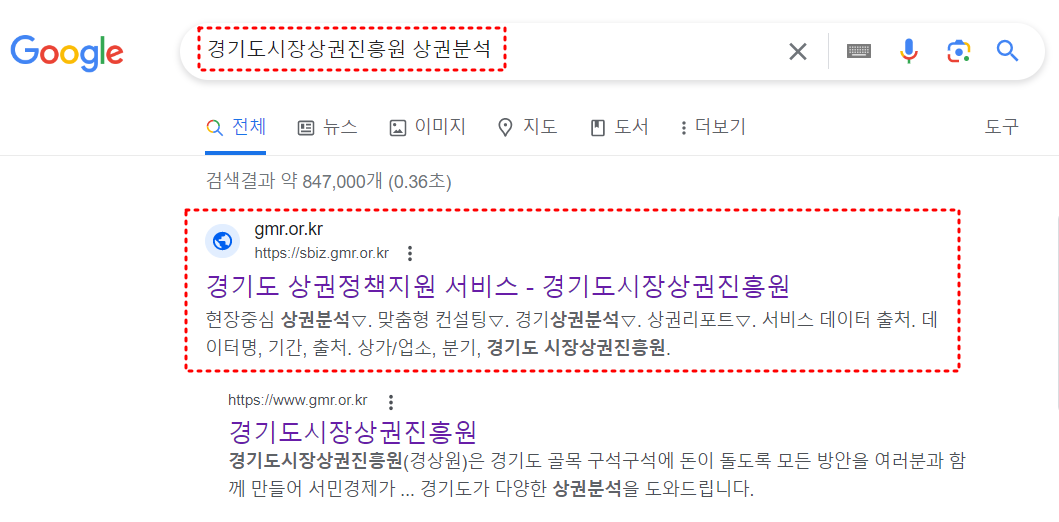 오늘은 경기도시장상권진흥원에서 운영하는 상권분석을 해보고자 합니다. 구글 검색창에 경기도시장상권진흥원 상권분석이라고 입력하면 아래와 같은 사이트가 나옵니다. 이곳으로 접속해 줍니다.