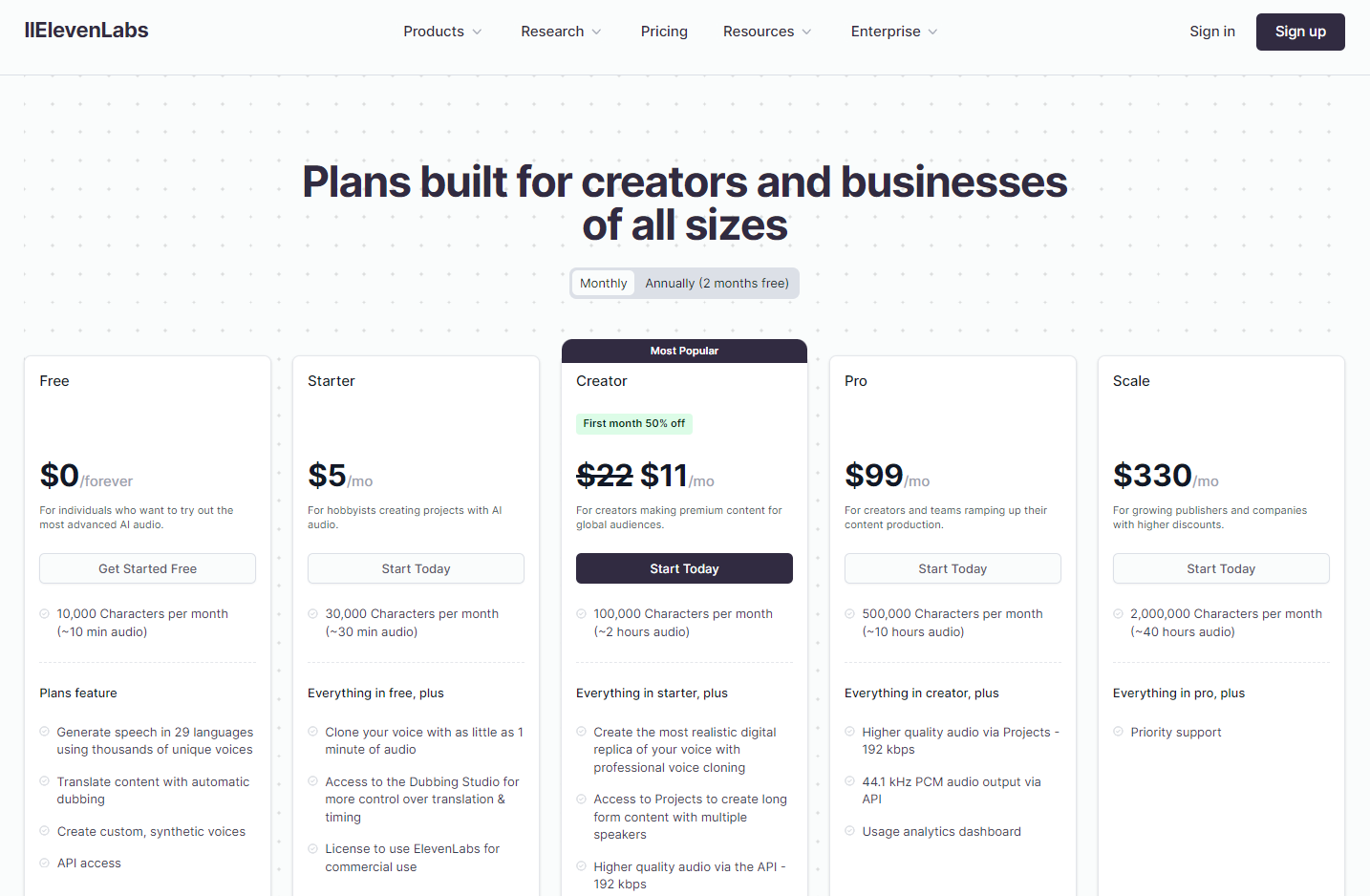 이렇게 일레븐랩스는 개인과 기업 모두를 아우르는 폭넓은 요금제를 내놓고 있습니다. 무료로 시작해서 점점 규모를 키워가며 기능을 업그레이드할 수도 있고, 처음부터 기업 수준의 플랜을 선택할 수도 있죠.