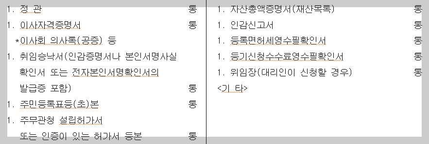법인을 대표하는 사람은 아래의 서류를 첨부하여 설립등기를 신청합니다(「비송사건절차법」 제63조).