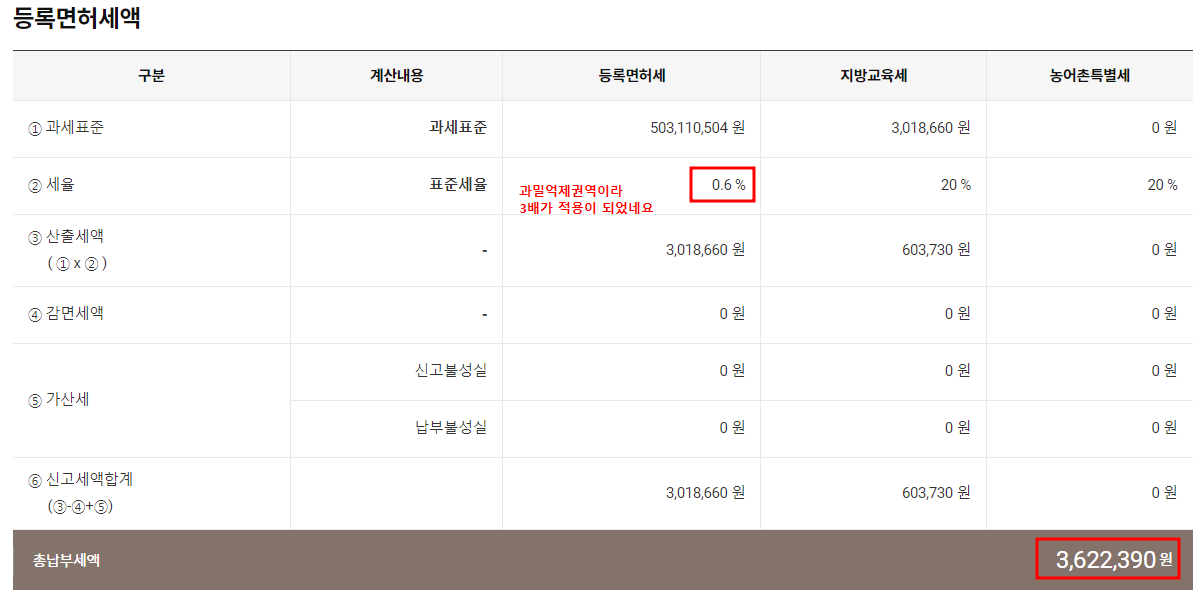 저는 임의로 성남지역에서 비영리재단법인을 설립한다고 가정하고 조사를 해보았습니다. 원래 출연재산의 0.2%이지만, 해당 지역은 과밀억제권역이라 3배가 가산이 되어서 0.6%로 적용이 되었네요. 지방교육세 20%를 더하여 산출이 되었네요.