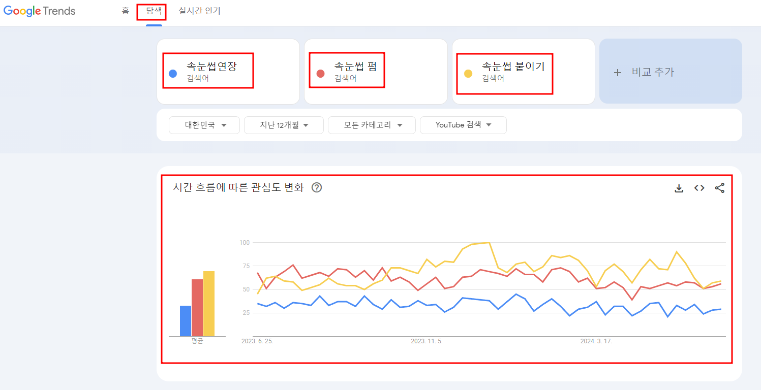 이 키워드를 가지고 구글 트렌드에서 분석을 해 볼 수가 있습니다. 유튜브 검색 기준으로 대체로 속눈썹 붙이기, 속눈썹 펌, 속눈썹 연장 키워드를 구글 트렌드에 붙여서 유튜브에서는 어떤 키워드가 많이 사용되었는지 볼 수 있는데요. 속눈썹 붙이기 키워드가 높은 것을 알 수 있어요. 그럼 다시 유튜브로 돌아가서 '속눈썹 붙이기' 키워드가 사용가 사용된 영상 중 조회수가 많이 나온 영상 (특히 구독자가 적으면서)을 벤치마킹 할 필요가 있습니다.