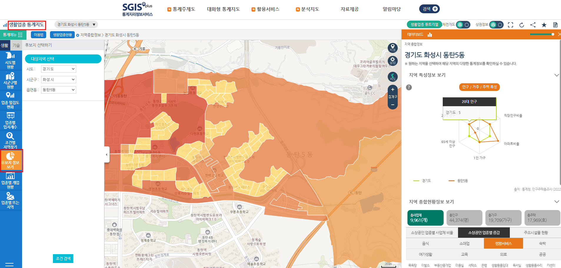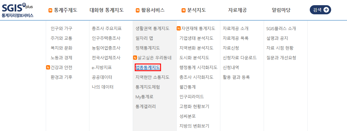 통계지리정보시스템은 통계청에서 운영하는 사이트인데요. 이곳에는 각종 통계 데이터를 제공을 하는데요. 우리가 창업하려는 인구 구성 및 업종 통계를 볼 수 있는 곳이에요. 해당 지역의 연령층이나 사업체 수 등을 파악할 때 유용하게 이용할 수 있는 사이트이죠!