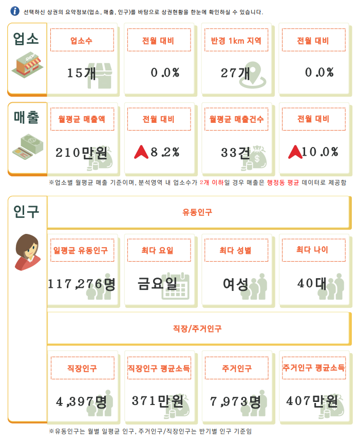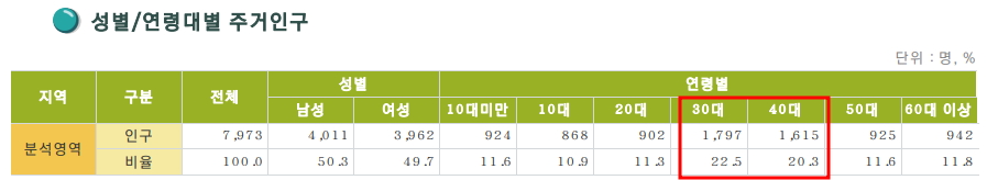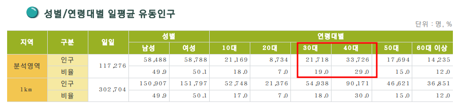 유동인구와 주거인구를 살펴보아도 30~40대 비중이 높다는 것을 확인할 수 있네요. 아무래도 젊은 여성분들이 많이 이용한다는 것을 알 수 있죠?