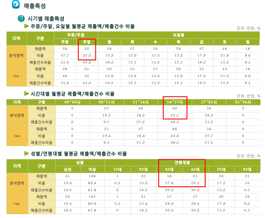 매출은 주말이 평일보다 높은 편이고, 토요일 매출이 좀 더 많은 상태이네요. 시간대는 점심 이후 오후 2시부터 5시 사이에 매출 비중이 제일 크네요. 낮 시간대 이용이 많은 걸로 봐서는 직장인보다는 30~40대 주부층이 이용을 한다고 유추해 볼 수 있는데요.