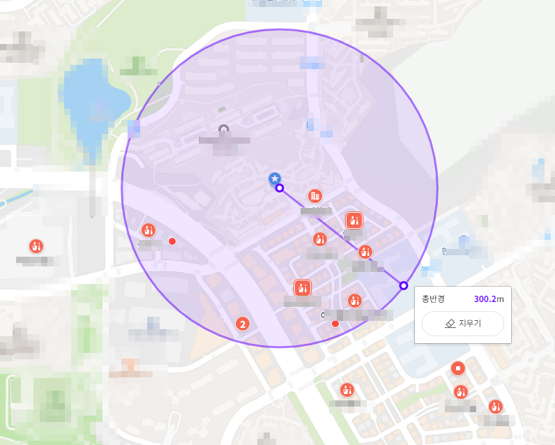 300미터 반경 안에 동종업종이 많이 보이네요! 동종업이 많다는 것은 경쟁이 치열한 지역이라는 것을 의미합니다.