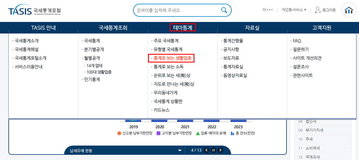 국세통계포털에 접속하고 상단 메뉴에서 테마통계를 선택하고, 하단 메뉴에 있는 통계로 보는 생활업종을 선택합니다.