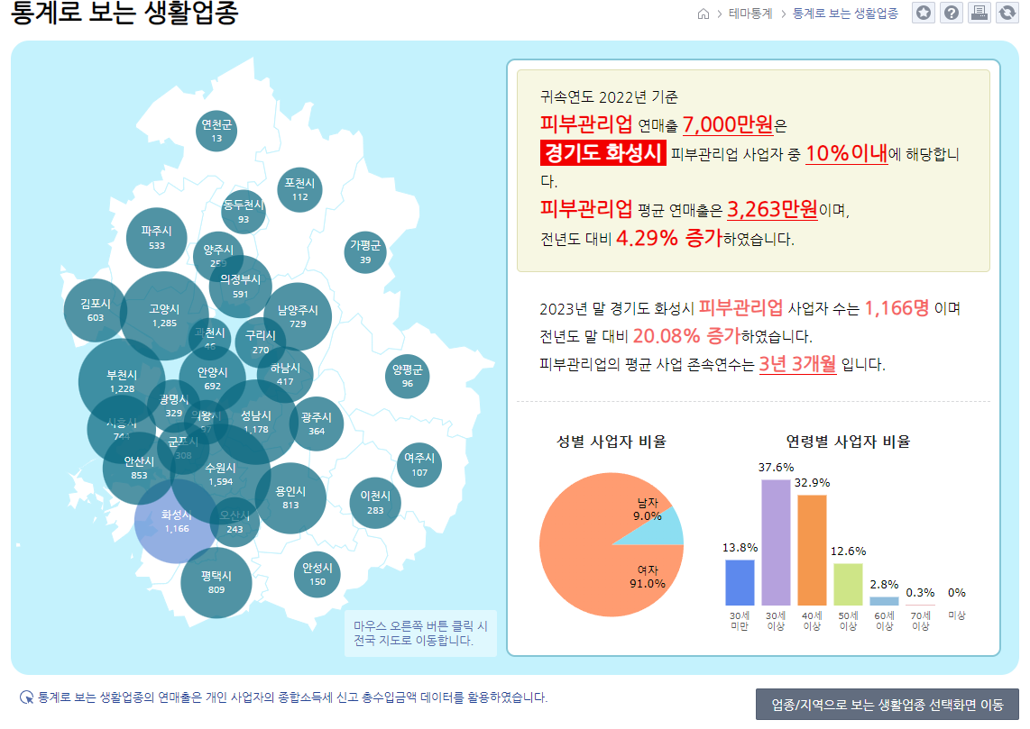 저는 화성시로 검색을 해보았는데요. 2022년 기준으로 피부관리업은 연평균 매출이 3,263만 원 수준이네요. 사업자수는 1,166명이고, 2021년 대비 2022년에는 20% 수준으로 업체수가 증가했다고 나오네요. 그리고 평균 존속연수는 3년 3개월 수준이에요. 사장님 성별은 여자분이 90% 수준이며, 30~40대 사장님의 비율이 높은 것으로 나타나네요!