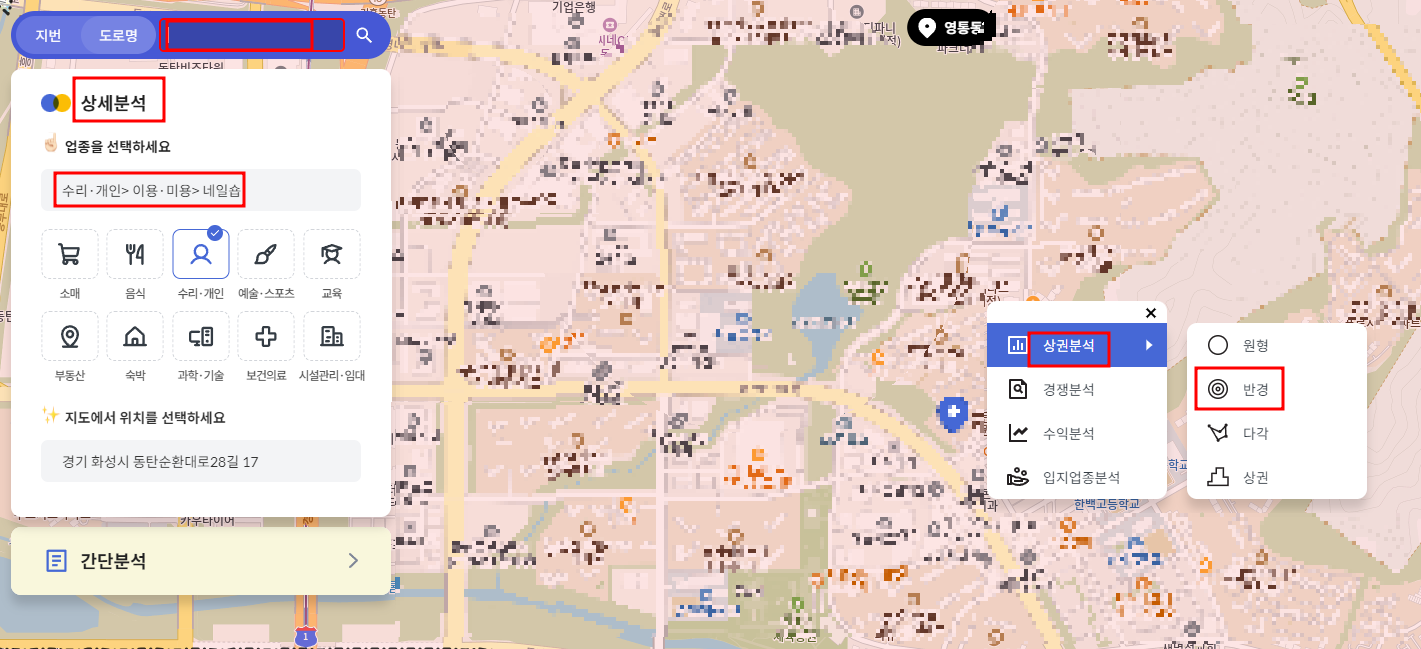 소상공인시장진흥공단에서는 상권분석시스템을 누구나 사용할 수 있게 제공을 하고 있는데요. 그럼 한번 살펴보겠습니다. 먼저 상세분석을 누르고 주소를 입력합니다. 그리고 업종을 선택합니다. 상권분석을 누르고 반경을 입력하면 해당 보고서가 생성되게 됩니다.