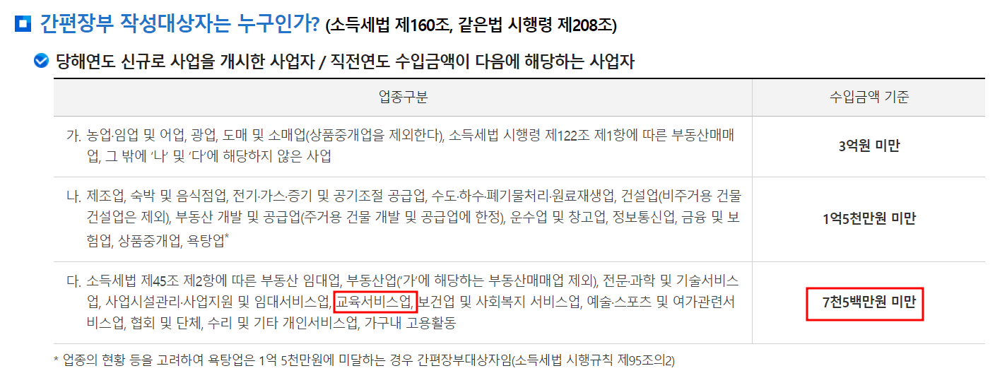 다만 직전년도 매출액이 7500만원 이상인 학원이 복식부기의무자이므로, 이때는 간편장부를 작성해도 장부로 인정해주지 않으므로 주의하여야하며, 일반적으로 세무대리인에게 의뢰하여야 합니다.