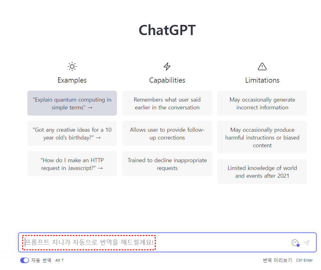그리고 나서, ChatGPT 화면으로 오시면 평소에 본 화면과 조금 다른데요. 프롬프트 지니가 자동으로 번역을 해드릴게요! 라는 친절한 멘트가 입력창에 보이네요!