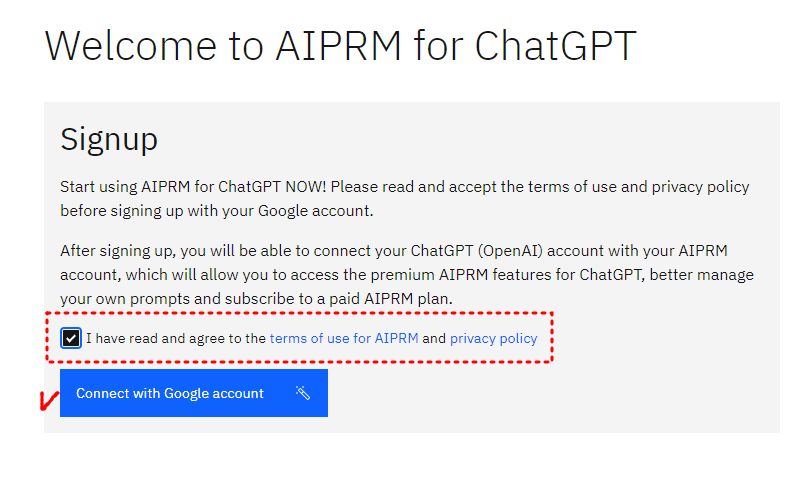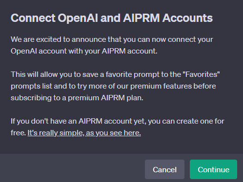 추가를 누르면 아래와 같은 화면이 나옵니다. 저의 오픈AI 계정과 AIPRM 계정을 서로 연결해주는 내용을 담은 공지인데요. 관심있는 프롬프트 목록을 저장할 수 있다고 하네요. 일단 continue 버튼을 누릅니다. 그러면 서명하는 화면이 나오는데요. 조항과 개인정보 정책에 관한 내용을 읽고 서명하라고 나오네요. 동의를 누릅니다.