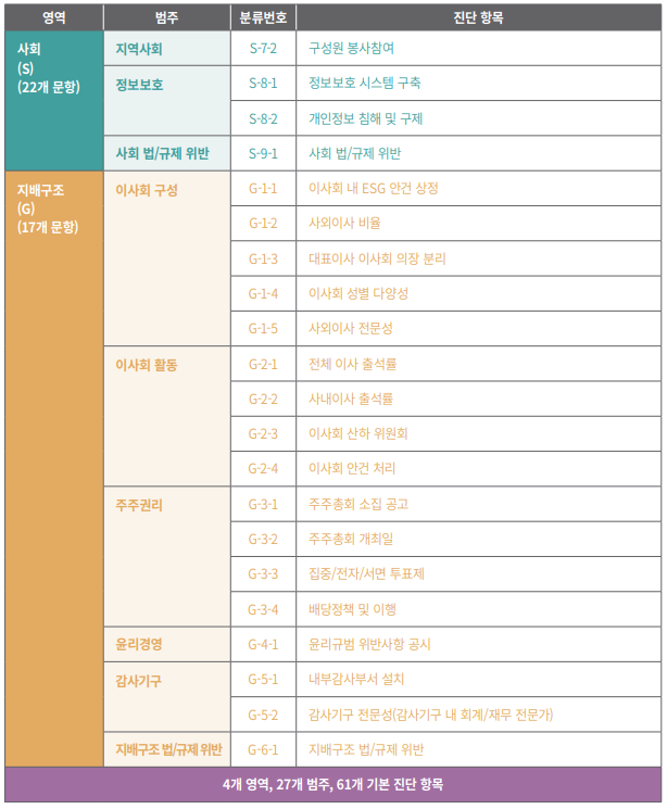 우리나라에서 만든 ESG를 K-ESG라고 합니다. 국내 ESG 가이드를 살펴보도록 하겠습니다. 아래 가이드를 살펴보면 ESG(환경,사회,지배구조) + 정보공시, 이렇게 총 4개 영역으로 구성되어 있습니다. 영역 - 범주 - 진단항목 - (세부지표)로 나눠져 있습니다. 진단항목마다 세부 지표가 있는데, 평가를 받는 기업이 세부 지표의 기준에 따라 점수를 부여받게 되는 거이죠.
